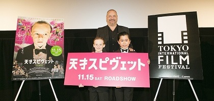 『天才スピヴェット』 11月15日(土)よりシネスイッチ銀座、ヒューマントラストシネマ渋谷ほか全国順次公開となります。 第27回東京国際映画祭の“特別招待作品”への選出が決定し、本映画祭にあわせて、ジャン=ピエール・ジュネ監督と共に本作で主演を務める天才子役カイル・キャトレット君が来日、公式上映の前に、ジュネ監督とカイル君の舞台挨拶を実施しました! また、特別ゲストとして日本の天才子役・鈴木福くんが二人の来日を祝し、会場に駆けつけました!