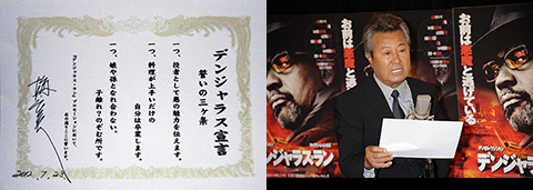 さらにデンジャラス会見の最後には”家庭人梅宮”を封印し、デンジャラスな男に戻る誓約書《デンジャラス宣言誓いの三ヶ条》にサイン。永遠に日本一デンジャラスな俳優、梅宮辰夫であることを報道陣にアピールし大盛り上がりのイベントとなりました。