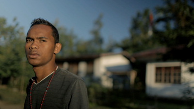 監督: ジョアオ役のグディーノ・ソアレスは撮影当時17 歳でした。東ティモールで独立に向けた住民投票が行われた頃、彼の父親はインドネシアの警察官だったので、彼の家族はインドネシアの支持をすることを余儀なくされ、結果東ティモールからインドネシアへ逃れることになりったそうです。軍隊や警察、公務員は、インドネシア側にならざるをえない状況だったのです。このような家族は当時大勢いました。いつかは東ティモールに戻りたいかと尋ねると、友人や家族に会いたいけれど住みには戻りたくないと言っていました。グディーノの印象ですが、とてもファンキーでお洒落な、魅力的な青年です。いつも首からロザリオを大切そうにかけています。