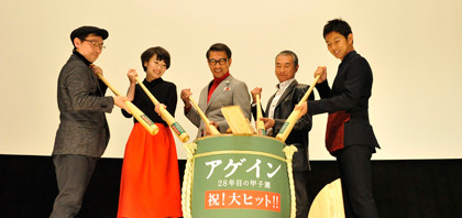 日 程:2015年1月17日(土) 上映終了後ということで感動の余韻に浸っている会場へ、中井貴一さん、波瑠さん、工藤阿須加さん、柳葉敏郎さんの豪華キャスト陣と大森寿美男監督が登場し、温かい拍手で迎えられました。 バットで鏡開き!お客様へ感謝の意味も込めて、サインボール投げも行われました! <舞台挨拶> MC:一言ずつご挨拶をお願いいたします。 中井貴一:晴天にも関わらず、暗い映画館へ足をお運びくださり、ありがとうございました。上映終了後の挨拶なので何を言ってもいいと思うのですが、僕はまだ観ていないので(笑)、話にズレが出てきたら、あいつまだ観ていないから、と思ってください(笑)昨今、大人向けの映画もテレビもあまりないですが、この映画は大人に向けて、今の想いや青春を魅せてくれる映画です。ぜひ大人たちに観ていただきたいと思います。 波瑠:撮影中は悩んだりくじけそうになったり、いろいろありましたが、(波瑠さん演じる)美枝の、届け!情熱、形になれ!と思って頑張りました。みなさんにこうしてお届けできることがとてもうれしいです。 工藤阿須加:中井さん演じる坂町の28年前の姿を演じました。野球をやったことがなかったので、素振りシーンでは素人に見えなければいいなと思い、そういうところから役作りを始めました。 柳葉敏郎:それぞれのアゲインを見つけていただけたでしょうか?大げさではない、派手ではない感動を見つけていただけたらうれしいです。 大森監督:この映画は野球の映画ではなく、キャッチボールの映画です。心のキャッチボールを描いたつもりです。今日観ていただいた皆さんが、我々の投げたボールを受け止めていただけたなら、誰か大切な人に投げ返していただけますと幸いです。 |