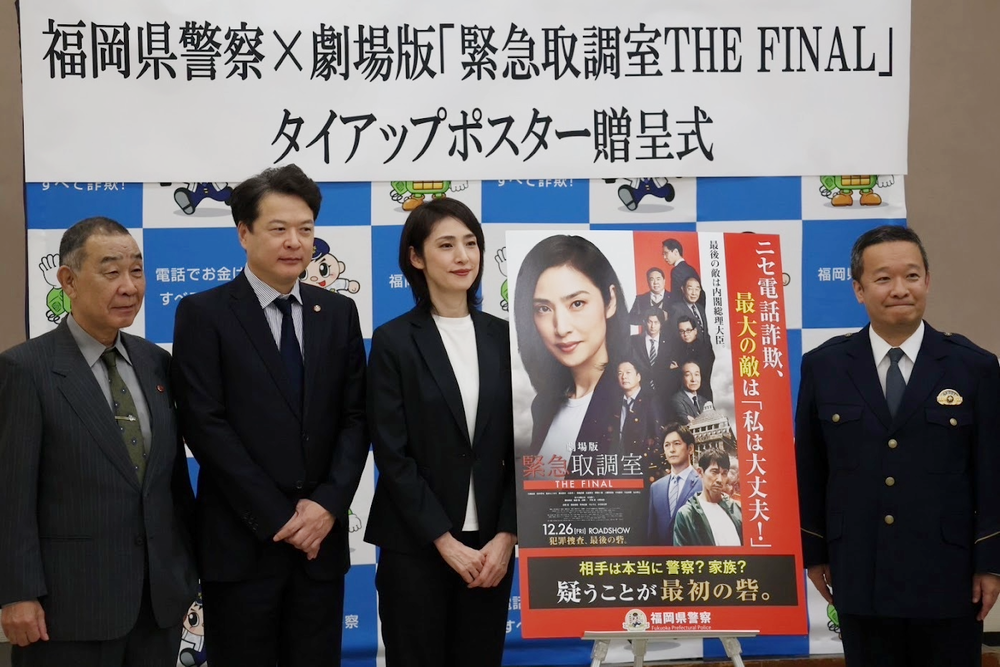 さらに翌日1月13日(火)には、福岡県警察にて劇場版「緊急取調室 THE FINAL」とのタイアップポスターの贈呈式が行われ、天海祐希、田中哲司、でんでんが福岡県警を表敬訪問しました。天海は今回のタイアップについて「人を信じることは凄く大切なことですが、信じるに値しない人もいて、そこをはき違えずに自分で見抜く力、おかしいなと思ったらそこに突き進んではいけないという事を一人一人が注意しなければいけないなと思います。」と語り、タイアップポスターを贈呈しました。また、福岡県警本部長らと共に、劇中でおなじみの「うぇ~い」ポーズでのフォトセッションも実施し、最後に天海から「私も何度か警察官の役をやらせていただいております。その度に、命懸けで私たちの生活を守ってくださっている方がいるんだということにいつも励まされます。」と力強い挨拶があり、贈呈式は幕を閉じました。