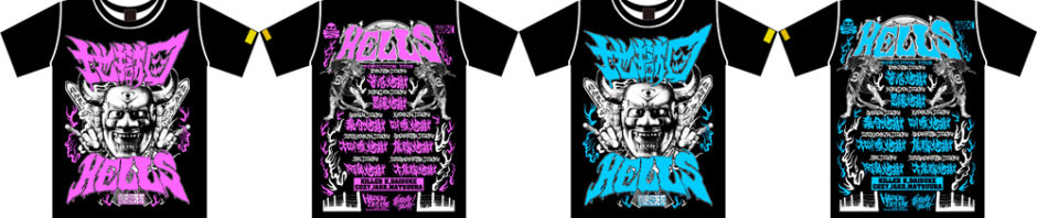 そんな“地獄図(ヘルズ)”をモチーフにしたTシャツは、フロントに“HELL”ポーズを決める鬼が堂々とプリントされ、とにかくインパクト大!!バッグプリントには、【DEMOLITION TOUR(破壊ツアー)】の文字と共に、『等活地獄』『黒縄地獄』『衆合地獄』…など数々の “地獄”がバンド名のようにずらりと並び、実際に音楽フェスで販売していそうな、リアリティ溢れる“音楽好き”にはたまらないTシャツに仕上がっています。