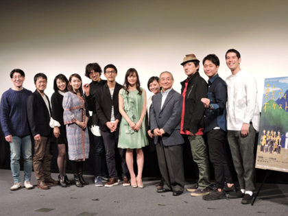 補助席を出すほど満席の客席に拍手で迎えられた坂下監督、主演の中西さんをはじめ、ワークショプで選ばれアマチュア楽団を演じた俳優陣ら総勢 12名が登壇した舞台挨拶。