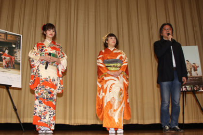 晴れ着で登場の女優のお二人と監督が登場すると暖かな拍手が。