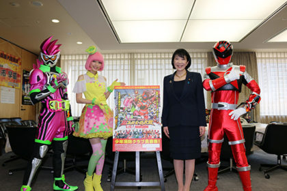 今回、総務省消防庁とタイアップし、 「みんながヒーローだ!~少年消防クラブで地域社会を守ろう~」 をキャッチコピーにタイアップポスターを制作し、少年消防クラブ員を募集します。そして本日3月17日(金)、高市早苗総務大臣のもとに仮面ライダーエグゼイドに出演しているポッピーピポパポ役の 松田るか、仮面ライダーエグゼイド、「宇宙戦隊キュウレンジャー」シシレッドが訪問し、少年消防クラブ員募集キャンペーンに協力する旨を伝えました。