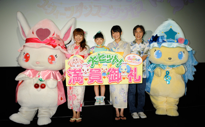 本日8/11(土)、全国100館以上での封切りを記念して行われたオープニングセレモニーでは、ゲスト声優でマーナ姫役として登場し、テレビアニメと映画の主題歌も担当している芦田愛菜ちゃん、レギュラー声優のルビー役・齋藤彩夏さん、サフィー役・ささきのぞみさん、ジュエルペットのルビーとサフィーもかけつけ、記念すべき映画公開初日を祝い、テープカットにくす玉割りと盛大に公開初日を祝いました。