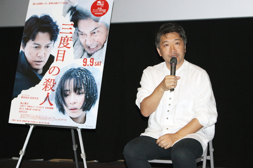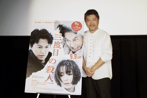 Q:根岸季衣さんが演じるアパートの大家さんのシーンは、監督らしいドキュメンタリータッチを感じましたが、彼女のセリフはアドリブですか?また、接見室で三隅が火傷の跡のいじるシーンが好きなのですが、監督のアイデアでしょうか? 是枝監督:裁判では、公判が始まる前に、三者で公判前整理手続きというものをやるんです。脚本を書くときに、弁護士さんに相談していたら、「日本の裁判はつまらない。公判前に証拠などを見せ合うから、始まる前にほぼ終わっているんですよ。」と言われました。国会で事前に質問を渡しておくのと同じことなんですね。それは映画で観れることはなかなかないし、ドキュメンタリーでも撮れないので、実際に弁護士さんにやってもらってシーンに残しました。僕も今回の撮影で初めて知って、面白いけど、怖いなって感じました。こうやって人が裁かれていく、その力が持つ怖さと知っていただければと思いました。 Q:この映画のエキストラに参加しました。当時はタイトルに(仮)がついていましたが、どのような経緯で決定したのですか? 是枝監督:最初の企画でつけていたタイトルには(仮)をつけていて、もっといいものがあるんじゃないかとスタッフたちとも話していました。『そして、父になる』のときは何度も変更がありましたから。でも、脚本を書く時に”一度目は獣、二度目はにんげんが殺した。三度目の殺人”というテーマを目指していたので、ブレることなく、このタイトルに決定しました。 Q:阿部寛さんが主演の『歩いても 歩いても』や『海よりもまだ深く』は、父親と母親の両方が出てくると思いますが、福山雅治さんが主演の本作や『そして父になる』では母親は出てこなくて、冷めた父親が出てきます。主演が阿部さんであったり、福山さんであるときに意識しているのでしょうか? Q:この映画は、”十字”っていうテーマであちこちに出てくるなと思いました。雪の上で寝転んでいるシーンでは三隅と咲江は十字で寝ているのに、福山は大の字。ほかにも、お墓の十字、最後の重盛が見上げた電線、重盛が立っている道路も十字です。雪のシーンのふたりだけが十字っていうのは、狙いがあったのでしょうか…? Q:海外から来ました。初のサスペンス映画ということで、以前の映画と全く違う雰囲気で撮られていましたが、今後サスペンス撮りたいですか?海外には是枝監督のファンが沢山いますが、海外のマーケティングを意識して撮りたい映画はありますか? 是枝監督:本作は通常のサスペンスにしては、犯人がはっきりしないから、カタルシスが生まれて終わるわけではないのでモヤモヤしますよね。霧が晴れるかと思えば、晴れないで終わるので、厳密にいうとサスペンスではないかなと自分では思っています。でも、カメラワークや美術、セットなどを含めて、ある種の犯罪映画という形を目指しながら撮った作品ではあります。僕としても珍しいアプローチだったなと思いますね。とても勉強になりましたし、面白かったけど、今後も撮るかなと思うとそうではないですね。今後もいろんなものを撮りたいと思っています。 |