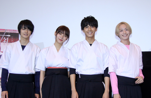 11月11日公開の『一礼して、キス』の完成披露先行上映会が行われ、弓道着に身を包んだ池田エライザさん、中尾暢樹さん、 前山剛久さん、結木滉星さんが登壇。