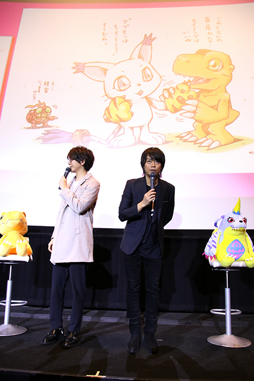 花江さん:見どころは太一が恰好いいシーンが多かったので、今まではうじうじだったんですが。5章で格好よくなって印象的で。監督からこのシーンはトライで伝えたいシーンだからちゃんとやってと。 浪川さん:今まではちゃんとやってなかった? 花江さん:今回はより気合を入れてということです! 浪川さん:デジモンはバトルシーンの進化。5章の進化凄いんです。究極進化!どこまで進化するんですかと、問いたくなる。来るぞ来るぞ!で来た時に、盛り上がれるのがデジモンの良いところですね。 と、良さを伝えます。 |