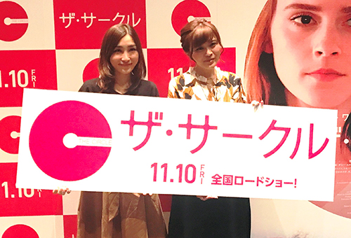 大勢のブロガーが待ち受ける中、はあちゅうさんと東紗友美さんが登場。 作品の感想を求められると、 東さん:バランスがいい映画だな、と思いました。SNSを題材に扱った作品だと『白ゆき姫殺人事件』だったり、『ディス/コネクト』のようなSNSは悪いことを描いているものが多かったけど、『ザ・サークル』の中では、SNSの良い側面も書かれていて、バランスがいいな、と思いました。 はあちゅうさん:リアリティがあると感じました。メイのような、SNSに慣れていない人がSNSを更新していくと逆にはまってしまう。初心者だと『SNSを更新しなきゃ』という、強迫観念の中でSNSを更新したりすると思うんですが、そこにリアリティがあったように感じました。 と、SNSを日常的に使っている2人だからこその感想述べました。 |