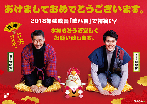 ちゃんちゃんこを着た中井貴一さん演じる古物商則夫と、佐々木蔵之介さん演じる陶芸家の佐輔がにっこりとお辞儀をしており、真っ赤な背景と鏡餅はまさに“おめでたい”雰囲気を演出しています! |