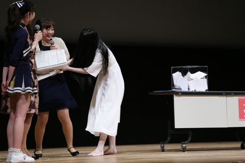 司会者:貞子さんも皆さんと同じ、今年で20歳になります。ご成人おめでとうございます! と呼びかけられると、貞子に対して会場全員から祝福の拍手が送られました。 |