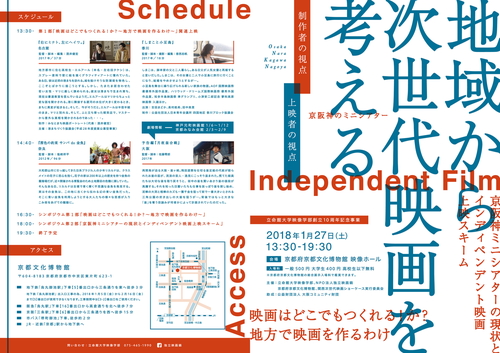 ■立命館大学映像学部創立10周年記念事業 「地域から次世代映画を考える:制作者の視点、上映者の視点」 『危機感』 こうした作品の受け皿になってきたのがミニシアターだがし、近年、地方のミニシアターにおけるインディペンデント作品の動員力の弱体化は、すでに興行としてはなりたたないレベルにまで達している。 一方で、国内外で高く評価された『野火』(塚本晋也監督、2015年)、『ハッピーアワー』(濱口竜介監督、2015年)、『淵に立つ』(深田晃司監督、2016年)など、芸術的成果を生み出している。日本映画の裾野を広げられるかどうかは、こうした自律的自発的な創造性に頼っている。 地方のミニシアターにも、これからの映画を担っていく若手作品を応援したい思いがある一方で、溢れかえるインディペンデント作品の上映がミニシアターそのものを圧迫することにもなりかねない。 そこで、今回の上映・シンポジウム企画では、第1部で「映画の制作側の視点」から、映画に関わる人材・情報・資金が一極集中する東京から遠く離れて、地方で映画づくりを続けていくことの意義を問い、第2部で「上映側の視点」から、京阪神のミニシアターの取り組みを事例に、これからのインディペンデント映画の上映環境を考える。 |