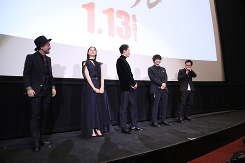 盛大な拍手の中、玉木宏さん、新木優子さん、吉沢亮さん、中村達也さん、中村哲平監督が登場!