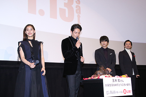 ここで、玉木さんが1月14日に誕生日!と言うことで肉好きな玉木さんのために4KgのTボーンステーキの肉ケーキがサプライズ登場!![]() 会場:玉木さんおめでとう! 玉木さん:凄いなー。 シェフが登場して肉を切り分け 最後に 中村監督:愛情込めてみんなで作り上げた作品です。色々な方に進めてくれると嬉しいです。 玉木さん:今日から公開、良ければお力をお貸しください! と、締めました! 『悪と仮面のルール』 2018年1月13日(土)、新宿バルト9ほか全国ロードショー!