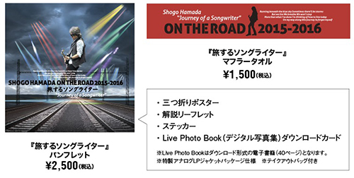 『旅するソングライター』初の全国映画館上映となり、浜田省吾の世界に迫った高密度な空間を届けることで、2018年2月から全国の映画館が新しい音楽空間に変わります! 2月2日(金)より公開の『旅するソングライター』の上映劇場にて、オリジナル劇場グッズの販売が決定致しました。特製オリジナルのマフラータオルやパンフレットだけでなく、2015年と2016年のライブツアーで販売された人気グッズも劇場販売が決定。当時入手できなかったお客様も今回が絶好のチャンスです。 是非ご注目下さい! |