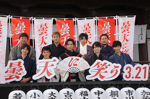 この度、公開に先駆け増上寺大殿内にて主演の福士蒼汰を始め、中山優馬、古川雄輝、桐山漣ほか総勢8名の豪華キャストと監督が集結し、プレミアイベント曇天祭りを行いました。 完成披露イベントでは、にて、本編の冒頭にも登場する和太鼓バンドGOCOOによるド派手な和太鼓パフォーマンスとともに曇印の特製山車に乗り和装を纏ったキャスト陣が境内へ豪快に登場!晴れを曇り空にする“曇天祭り”が行われました! 『曇天に笑う』 “曇天祭り”プレミアイベント 本編の冒頭にも登場する和太鼓バンドGOCOOによるド派手な和太鼓パフォーマンス |