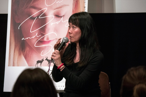 司会の矢田部氏より、講義の前に日本最速上映が行われた『心と体と』の着想について聞かれ