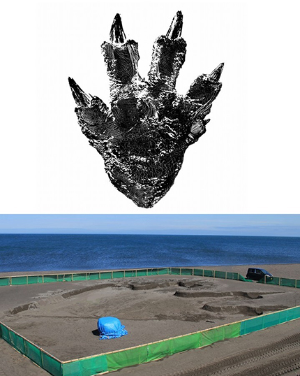 約縦27.9m×横22.0mの足跡が北海道・あそびーち石狩(石狩浜海水浴場)に! これは、あの巨大生物の足跡! 7月29日(金)に公開される映画『シン・ゴジラ』その公開を記念し、開催される いしかり浜サンドパーク2016特設会場に実物大サイズの『シン